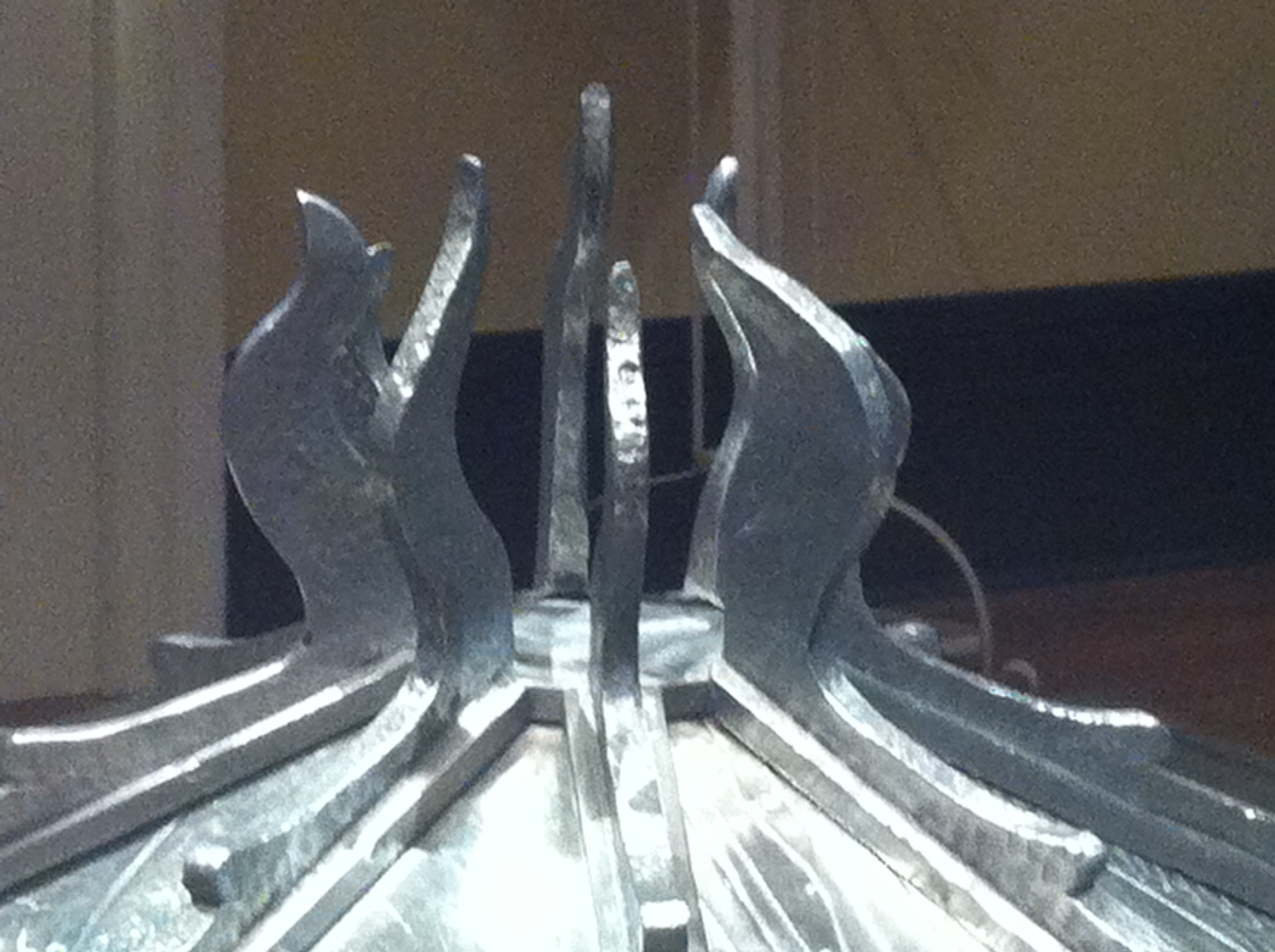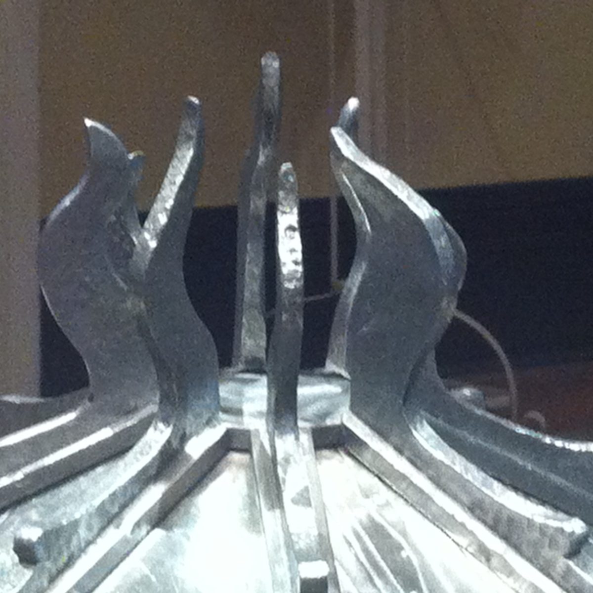 Flame at the top of font lid recalls flame sculpture that contains the Easter Vigil fire.